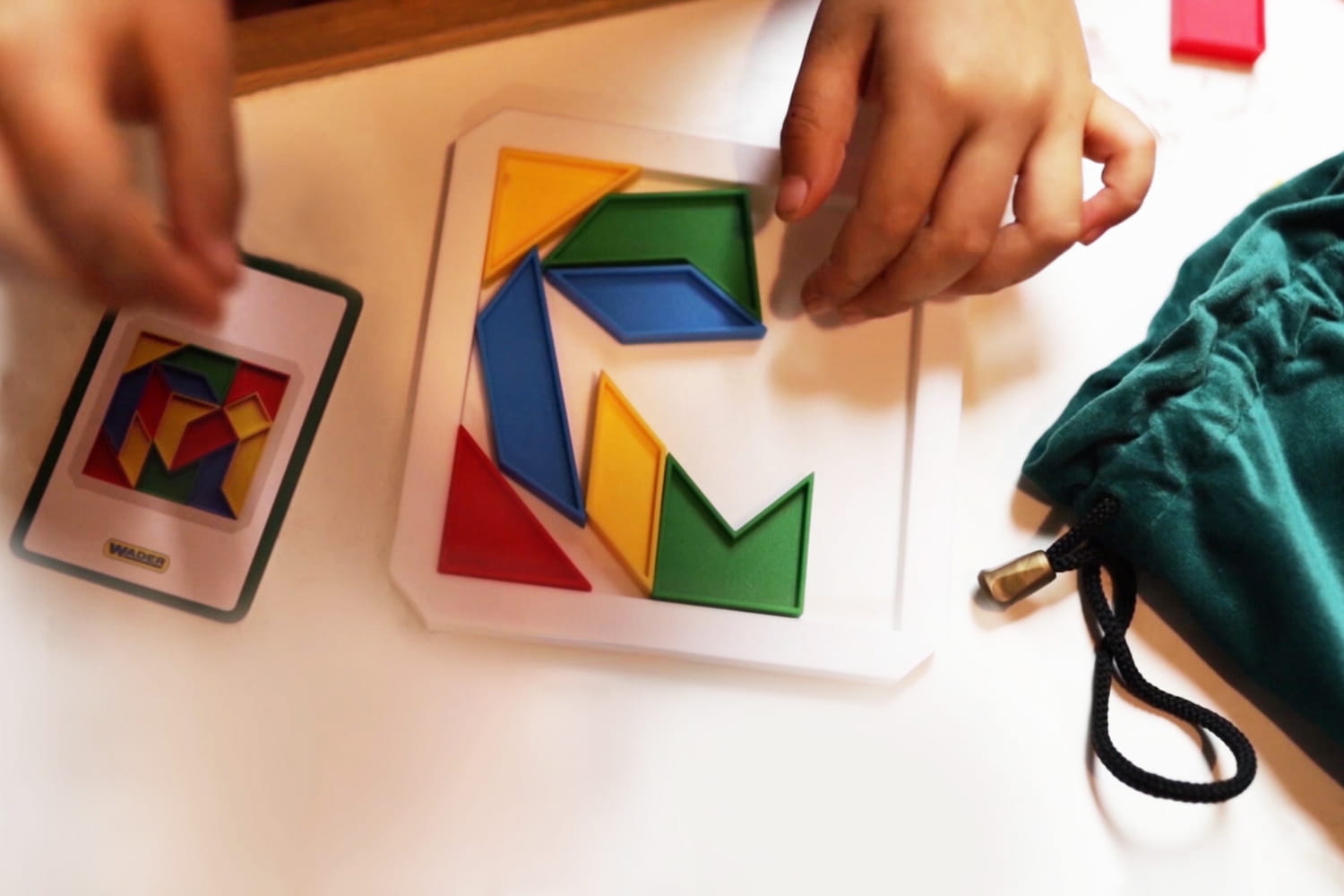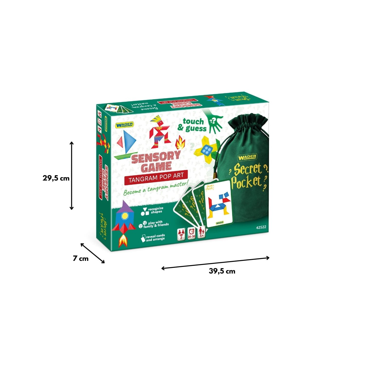 Tangram fejlesztő játék Tartalma: 1 darab „Titkos zseb” bársony húzózsák a formák tapintásos felismeréséhez 40 darab különböző alakú és színű tangram puzzle elem 2 darab kirakó alátét a minták összeállításához 2 pakli formafelismerő kártya 1 pakli művészi kompozíciókat tartalmazó feladatkártya 1 pakli haladó tangram kihíváskártya játékszabály