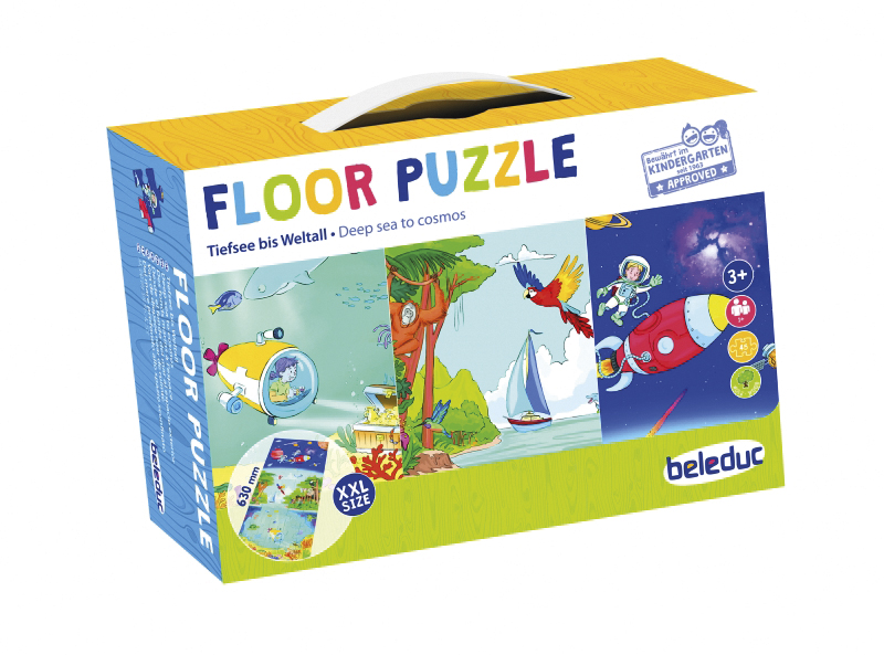 A Beleduc padló puzzle készlete egy nagy kirakó, amelyet a padlón kell összeépíteni.