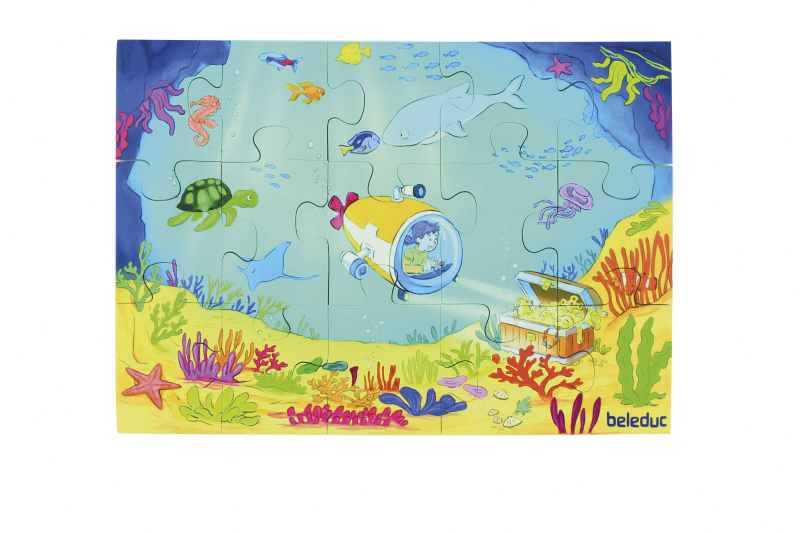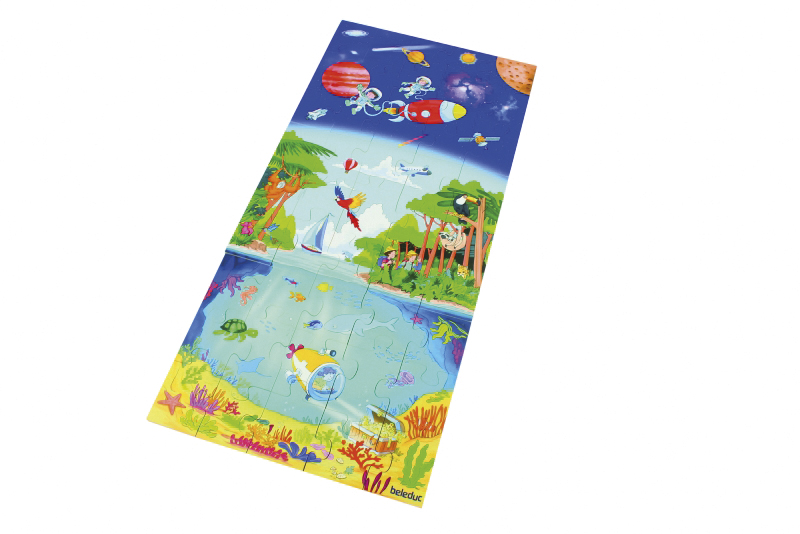 A teljes, kirakott puzzle egy komplex látképet mutat, melyben megismerkedhetnek a gyerekek a tenger alatti világgal, a szárazfölddel és az űrrel is.