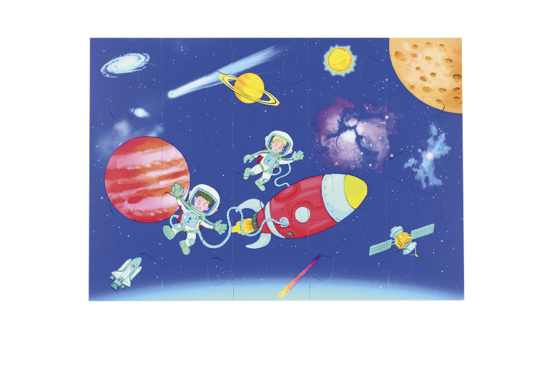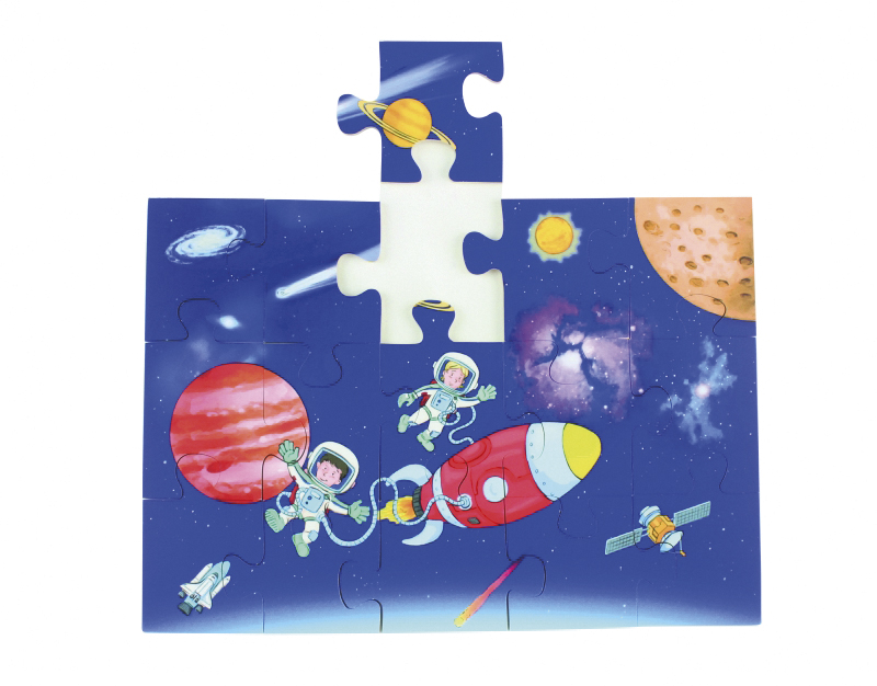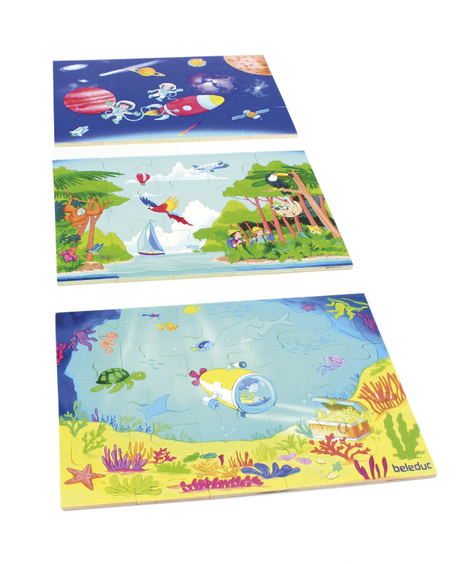Tartalma: - 45 db nagy puzzle elem 3 képet lehet kirakni belőlük. Képenként 15 darab elem. Témák: víz alatt, földön, űrben Kép mérete: 29,8x63x0,6 cm