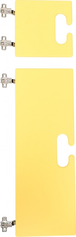 Ajtószett Bambi gyereköltözőhöz. Az ajtószett 2 db, citromsárga ajtót tartalmaz. Az ajtók 2-2 strapabíró kivetőpánttal csatlakoznak a szekrényhez. Külön fogantyúja nincsen, szépen megmunkált ovális kivágások segítik a kinyitást, illetve biztosítják a szekrény, így a benne lévő ruhák szellőzését is. Az ajtók anyaga színes MDF bútorlap. A felső, kisebb ajtó mérete: 20x20 cm. Az alsó, nagyobb ajtóé: 20x57,5 cm.