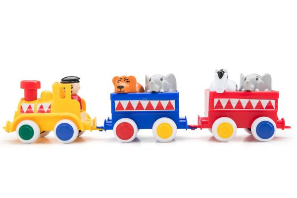A cirkuszi vonat 45 cm méretű, 1 db mozdonyból és 2 db vagonból álló, színes játékszerelvény.