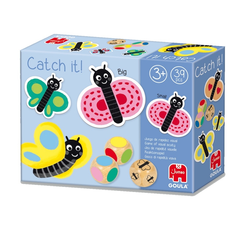 Találd meg! - Pillangó, Kombinációs társasjáték, GOULA A Goula Találd meg! pillangós társasjáték egy több szabály alapján játszható memória és figyelemfejlesztő játék. A doboz tartalma: - 3 db fa dobókocka, 2 db szín- és 1 db méretdobó - 36 db karton lepke kártya - Játékleírás A készletben megtalálható lepkék különböző méretűek és színeik is eltérnek. 3 Éves kortól ajánlott! Játékidő: 10 perc Ajánlott korosztály: 3 Év