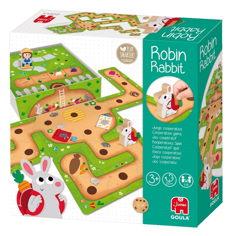 Nyuszis útvesztő - Kooperatív társasjáték, GOULA Segíts a nyuszinak a répát eljuttatni az odújába ezzel a kooperatív társasjátékkal! A doboz része a többféle variáció szerint összeállítható, 15 elemből álló karton pályának. A doboz tartalma a következő: 1 db karton veteményeskert játéktábla 1 db fa dobókocka, 1, 2, 3 számokkal és a farmer ikonjával 2 db fa figura (Farmer, Nyuszi hátizsákkal) 4 db különböző színű karton répa 19 db puzzle pályaelem (15 darab a pálya megépítéséhez, 4 db raktár a zöldségeknek) Társasjáték 2-4 játékos számára 3 Éves kortól.. A doboz mérete: 23x23x7 cm. A fa figurák mérete: 5-6 cm. A dobókocka mérete: 2,5x2,5 cm Játékidő: 20 perc Ajánlott korosztály: 3 Év