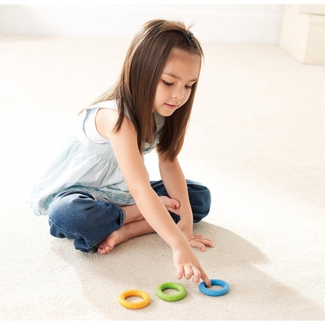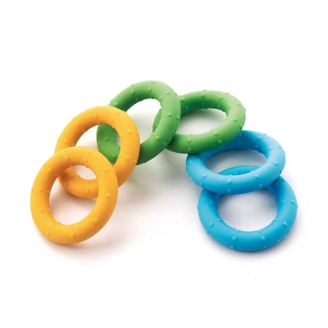 A készlet tartalma: 6 db 6,5 cm átmérőjű, 1 cm vastag gumikarika három ellenállási szinten: sárga-puha zöld-közepes kék-kemény 12 hónapos korú gyermekek számára CE minősítéssel ellátva!